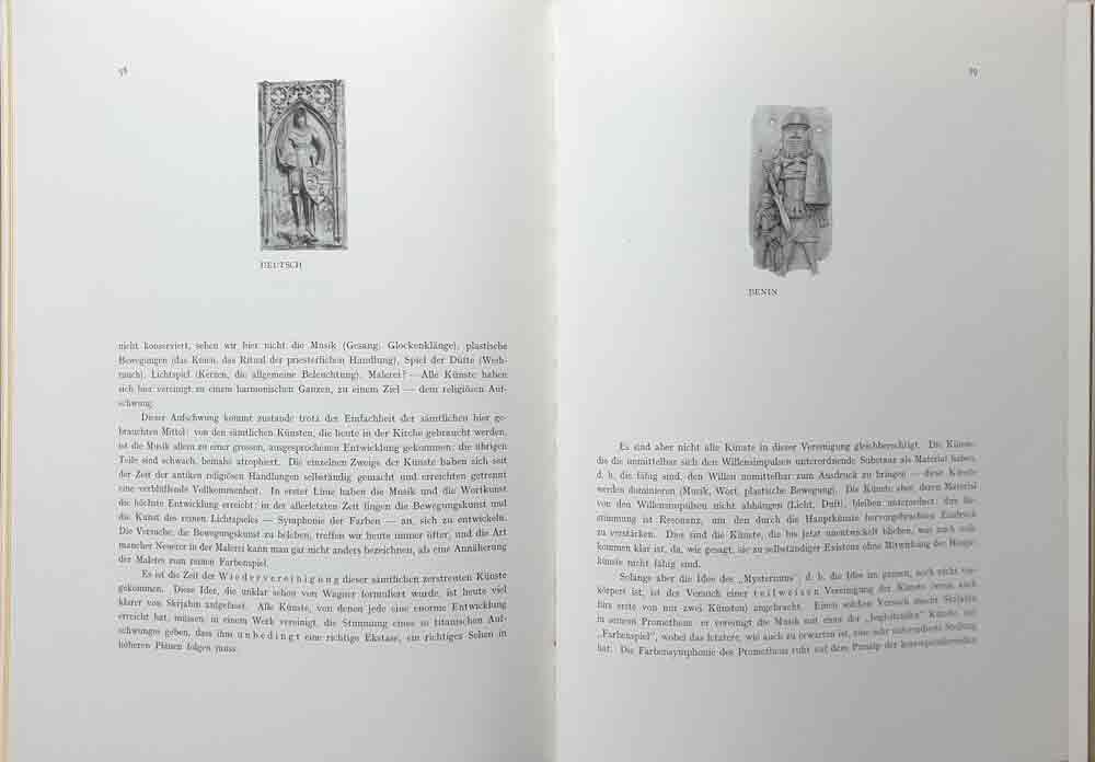 In his article, the artist Macke stressed that for Africans their “idols” (Idole), as he called their sculptures, were a “visible expression of an invisible idea”, “a personification of an abstract term”. He also stressed the equality of the art forms from different times and regions. For example, Macke valued bronze works from the kingdom of Benin, in what is today Nigeria, and other ethnographic works, because they are just as expressive as a grave marker in the cathedral at Frankfurt. To demonstrate this non-hierarchical attitude to art from different regions and times, Marc and Kandinsky placed two photographs side by side on a double page in the almanac – on one side the Gothic figure of a knight, and on the other a bronze plaque showing a soldier from the kingdom of Benin, which also was in the collection of the Munich ethnological museum by then (Fig 1).